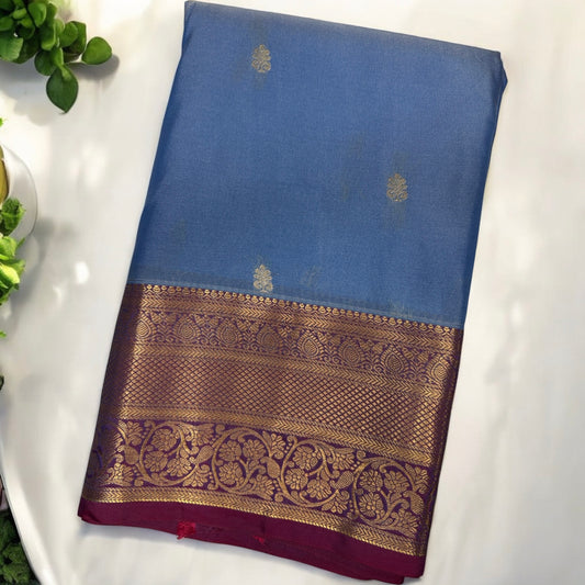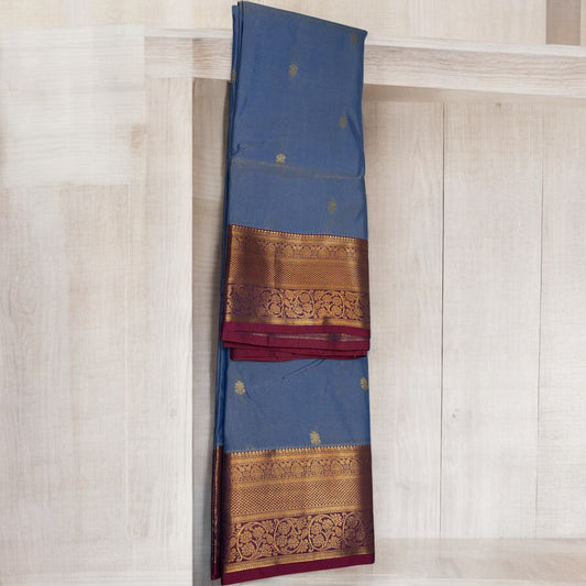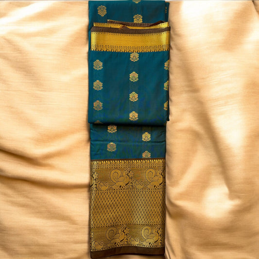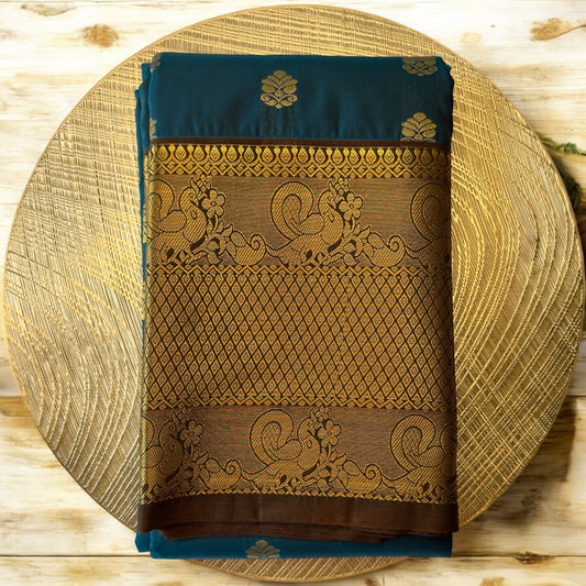 SILK SAREE – CLASSY BLUE WITH FLORAL BUTTA AND RICH GOLDEN-BROWN BIG BORDER
