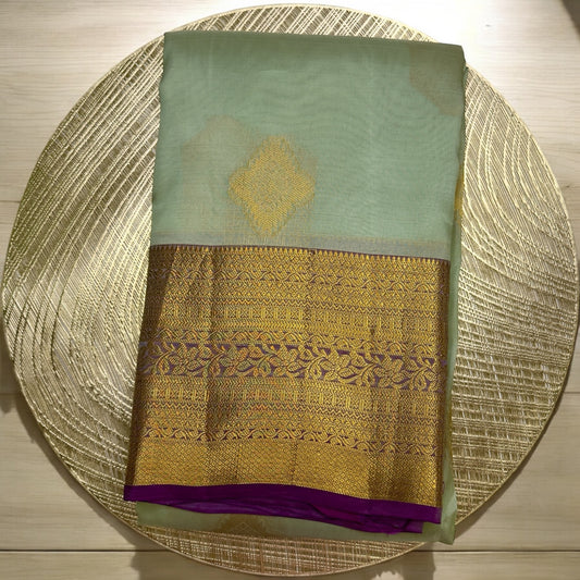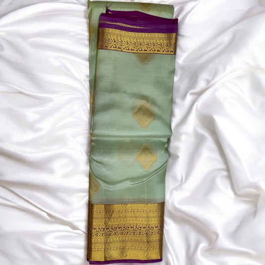 PURE SILK SAREE – PISTA GREEN WITH DIAMOND BUTTA AND PURPLE MEDIUM BORDER