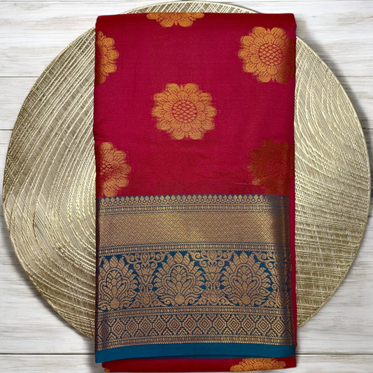 SILK SAREE – DARK PINK WITH FLOWER BUTTA AND GOLDEN GREEN BIG BORDER