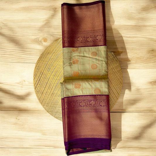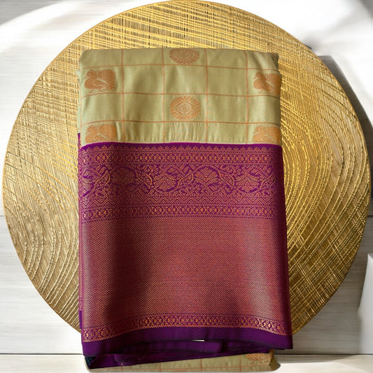 SEMI-SOFT SILK SAREE – PISTA GREEN WITH SMALL CHECKS AND PEACOCK BUTTA + PURPLE-GOLDEN BIG BORDER